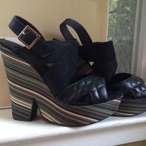 So fun! These striped heels are accented with earth tone canvas on the 4.75 in heel & 1.25 in platform. Black vegan suede & quilted textured vegan leather crisscross the toe & wrap the ankle. Man made. New in box. Retail $60. I give my lowest prices upfront ๐โบ๐ Thanks for looking!