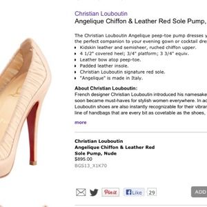 Beautiful Heels!! Brand new. Never worn(only to try on). Lost/misplaced my receipt so can't get a refund or exchange. :( Need to sell because turns out the heels are too high for my fiancé. I don't want to be taller than him. These are 100% authentic or your money back!!! Last picture is the information about the shoe, couldn't find the white online. SIZE: 39.5. These fit a size 9.. COLOR: Off White 😍😍😍😍895+tax. Everything you see is included. Just as packaged. $500 PayPal