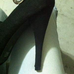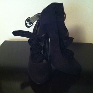 Black suede, rosette t-strap buckle at ankle heel 5 inch heel, never worn