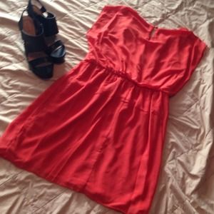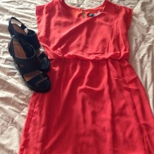 Adorable burnt orange chiffon like dress. Empire waist, short sleeve, key hole in the back.