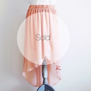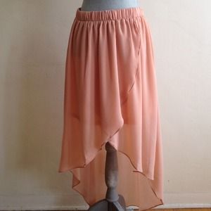 | Host pick | chiffon tulip style high low skirt. ☀ a comfortable and so pretty. Pulls on with elastic waist. Lined. Size L | peach | shown with turquoise chiffon tank top, listed in my closet.