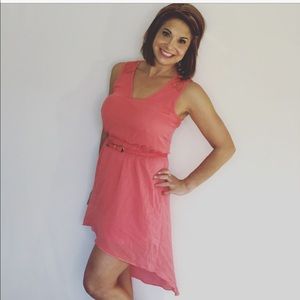 NEW WITH TAG. CORAL HIGH LO DRESS WITH CORAL & GOLD METAL SKINNY BELT. LACE ON UPPER BACK, & SHOULDERS, AS SHOWN. SHEER, BUT FULLY LINED