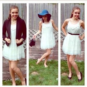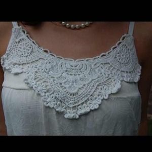 This piece has layers of white lace seen together, with a lovely design at the top! Has spaghetti straps, so good to be worn with a strapless. It fits loosely, as shown in photos--so you can wear it as-is, belted, and I even loved to wear it with a blazer! This dress is pretty & classic, yet allows for much creativity. β€ππ