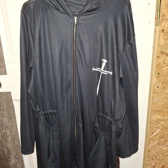 Stylish black hooded jacket featuring a unique cross x skull design. Perfect for casual wear. With hood!