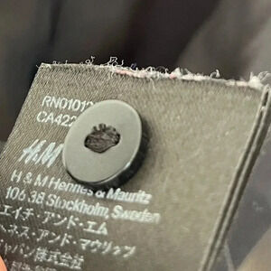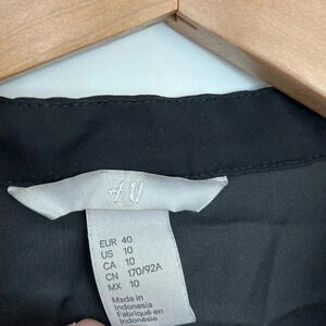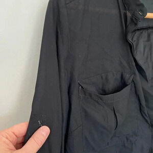 A relaxed black button-down shirt with a V-neck collar and three-quarter length sleeves.One of the sleeves button is missing but there is a spare one easy to add.