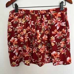 Vibrant floral skirt. Features red and orange flowers. Perfect for a casual outing.