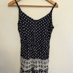 Garage onepiece, jumpsuit size small, Stylish navy blue onepiece with intricate white patterns. Features spaghetti straps and a comfortable fit. Perfect for casual outings. Like new
