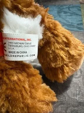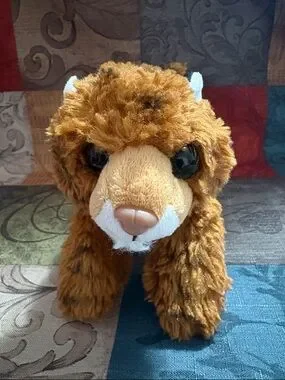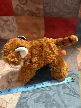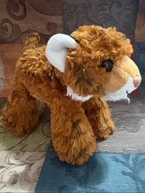 Soft brown tiger plush. Fluffy fur with white ear and muzzle accents. Black plastic eyes and stitched nose. Great for display or play. Cute and cuddly. Great used condition.