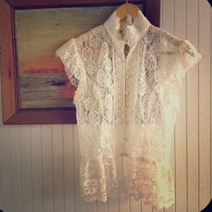 Ivory Lace Peplum Blouse with pearl buttons. Lace ribbon placket, raw edge at sleeves, triangle lace edging at neck. Label reads "Romantic Renaissance Bridal Collection" Gunne Sax by Jessica McClintock. Garment measures: Chest: 34". Waist: 30"