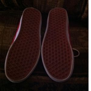Red vans. Used, minor scuffs, somewhat dirty inner sole, but still in good condition.