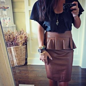 Scream fall! The peplum design gives feminine girly taste, brown leather for a bit of edge. Awesome skirt. It says M but runs more like XS-S.