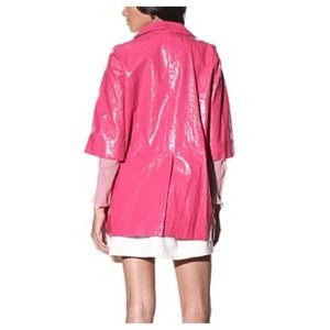 Brand new coated linen coat with tie by Chloe in magenta color. Coated linen with sheen, notched lapel, button closure with attached tie, 2 zip pockets, back vent. Made in France. This is an authentic product.