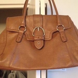 Brown leather with big gold buckle flap, one inside zip pocket, two open inside pockets.