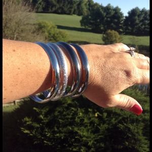The two bracelets closest to the fingers are gunmetal toned. 2 are silver toned and 1 is shimmering silver. Price is for all bracelets.