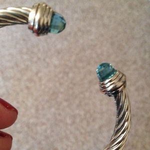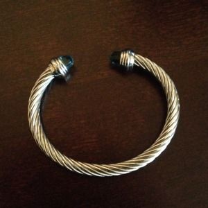 Gorgeous piece to add to any fashionistas closet. Bangle has a rope detail around the entire bracelet and two blue stones at each end. This piece is silver plated and NOT sterling silver. Item was never worn. There is no tarnishing. Comes from a smoke free home. Thanks for looking!
