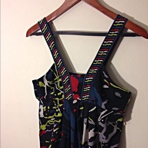 This is a multi color top with v neck straps. It is an empire waist and has a baby-doll style.