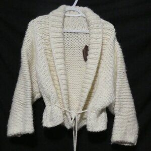 This ivory piece features an open front and a relaxed fit, accented with a matching belt for added style and comfort