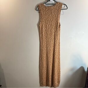 Embrace elegance with this sleeveless sandatone speckled with white dress featuring a delicate feminine bohemian style. Stretchy for comfort and to show your curves. Cotton linen blend. Dress up or down.