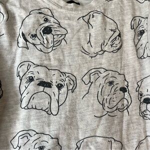 Adorable Appaman boys’ long sleeve shirt in size 4T, made from soft 100% cotton. Features a fun all-over bulldog face print in black on a heather gray background. Crewneck style with a slightly curved hem. Comfy, playful, and great for layering or wearing solo!