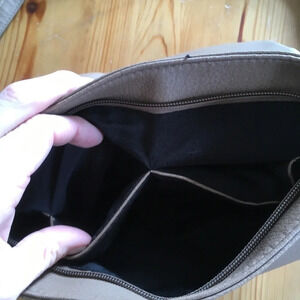 Vegan leather beige purse with black fabric interior. Inside there are a couple of pockets and the flap portion also has a zipper!