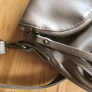 Vegan leather beige purse with black fabric interior. Inside there are a couple of pockets and the flap portion also has a zipper!