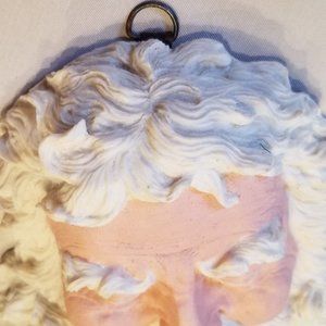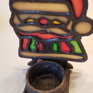 Five pieces of ceramic, glass/metal, and plaster cast head of Santa . The bear jar measures 4" across and is great for kitchen utensils, the glass and metal Santa (stained glass) is for a tea light or votive and will reflect the colours, and the snowman and little santa are for tea lights/votives as well. Note: the little snowman tea light holder has some discolouration from wax.