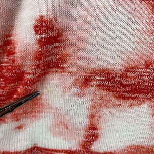Womans top orange and white, has a couple small stains please review all photos. Measurements are in the description.” no material or size tag