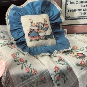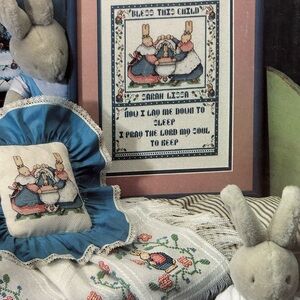 Charming embroidery set featuring a 'Bless This Child' design. Includes framed art, pillow, and blanket with adorable bunny motifs. Perfect for a nursery.