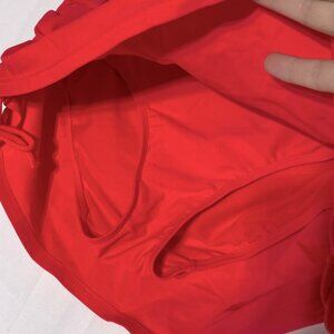 Vibrant neon orange swim skirt with adjustable sides. Perfect for beach days.