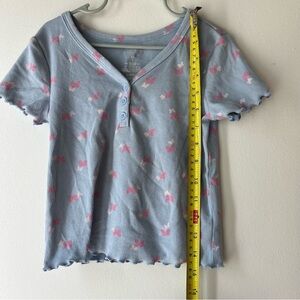 Adorable ribbed henley-style short sleeve tee by Member’s Mark in a girls’ size 6. Light blue base with a sweet pink butterfly print, functional front buttons, and cute lettuce trim on sleeves and hem. Super stretchy and comfy for everyday wear.
