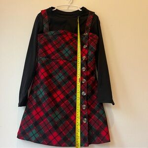 Adorable girls’ 2-piece holiday outfit by Monkey Bars in size 6X. This festive set includes a red and green tartan plaid pinafore-style dress with decorative button detail and a long sleeve black top underneath (attached). Soft and stretchy with a comfortable fit. Smocked back for ease of wear. Perfect for Christmas parties, photos, or any festive