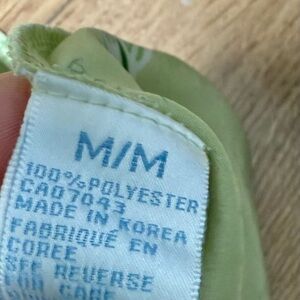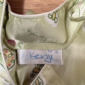 Charming slip-on featuring pink floral designs and light green silky fabric.
