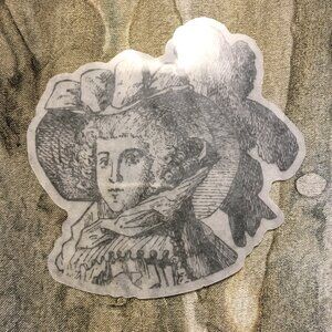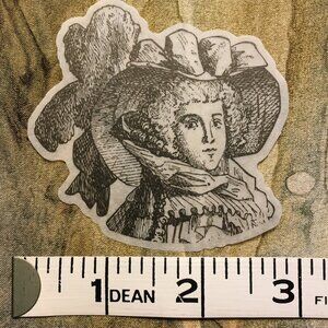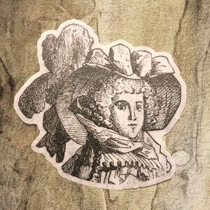 Excellent unused condition clear sticker with black pen drawing illustration or lithographic portrait. I'm pretty sure this is based on a pen drawing of Marie Antoinette in a stylish hat. Mix and match. Several to choose from. Great for Halloween, historic fans, laptops, notebooks, etc.