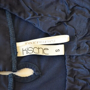 Navy sleeveless top with silk-ish detail around the neck. Button at the back for closure.