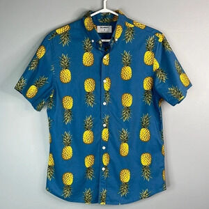 5/$25 OLD NAVY Mens Pineapple Print Button Down Shirt Blue Short Sleeve S