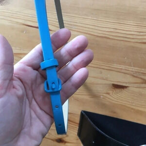One skinny belt with blue shiny outside and silver inside, and a black stretchy belt.