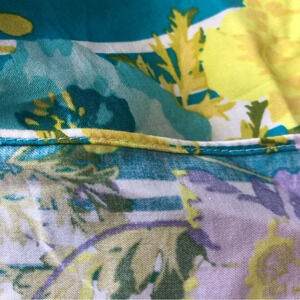 Turquoise and white stripes lead into gorgeous pink/yellow/teal/purple flowers.