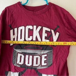 Fun and sporty boys graphic tee by The Children’s Place, size 7/8 (M). Red long sleeve shirt with bold “HOCKEY DUDE” text, hockey puck and crossed sticks graphic. 100% cotton, soft and comfy for everyday play or cheering on the rink. Gently worn, no stains or holes. Measurements included in photos. Smoke-free home.
