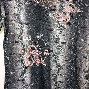 5/$25 Top L Grey Black Roses Silver Sparkle Short Sleeve T-shirt Style