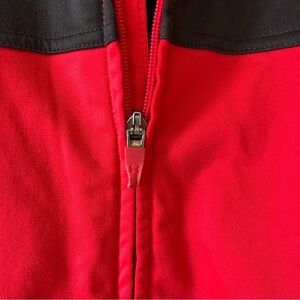 Sporty Under Armour kids sweater in bold red and black color block style. Features the classic UA logo on the chest, stand collar, and full front zip. Soft, comfy material perfect for layering on cooler days. Youth size 4, made in Malaysia.