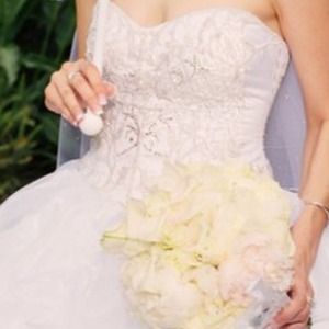 I had my wedding dress made from scratch just for me. It cost me $3,000! It's been worn once then dry cleaned and preserved in a box. It is in perfect condition. The beading work on the corset bodice has tons of Swarovski crystals on it of all shapes and color tones. It is a sweetheart neckline and the skirt is pure organza with Swarovski beaded pick ups all over. Will include crystalized two layered veil. SERIOUS BUYERS ONLY PLEASE. WILL TAKE BEST OFFER!