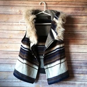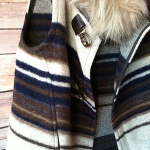 This is such an amazing vest. The colors are neutral and it can be worn with anything! Wool blend. Hooded with faux fur trim. 2 metal clasps. This is new and never worn just no tag. Amazing fall/winter find!!