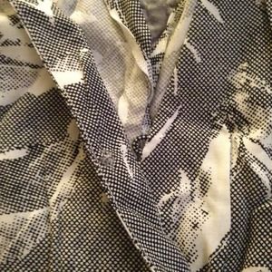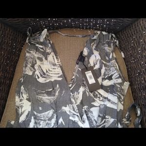 Deep V-neck, self-tie belt. 100% rayon. Machine washable. Brand new with tags. Never worn. Missing one button at the chest.