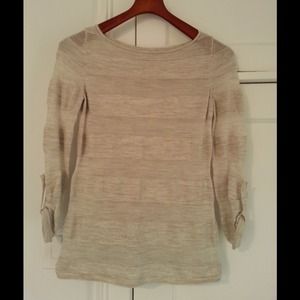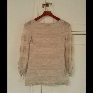 Ann Taylor LOFT light creamy gray striped sweater with opaque & semi-sheer stripes. Features 3/4" sleeves with button cuffs. Has one small fabric pull as seen in last photo. In good used condition. Size is Small.