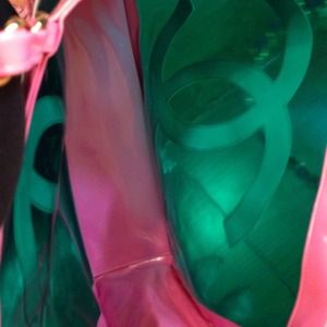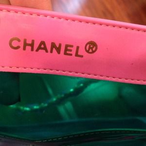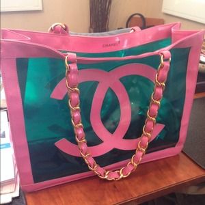 Authentic Chanel see through translucent pink and green tote. This bag is huge and amazing!!! Such good condition. Some damage to the serial number but I guarantee all my items authentic! Everything I have sold and traded is authentic. Feel free to check my feedback! This bag can hold so much! Great for work, running errands, beach, gym, anything! Measures 16.5" x 13" x 5" with a 12" strap drop