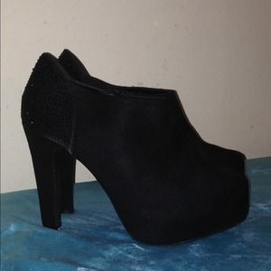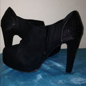 Very sexy black heels with round front . Black jewels on back on heel for extra glamour ! Very Small white mark on back of heel but was brought like that. See pic. Worn once. Great condition! 10wide!