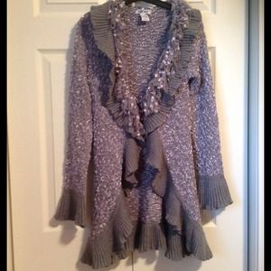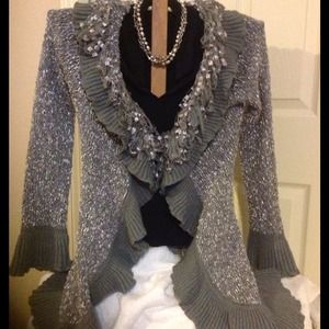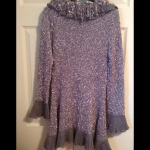 Very Sassy and Comfortable. knee length. It is a light grey with sillver tones. Size medium but runs a little small. Fits sizes 4 & 6 and up to a 34 D Bust. 60% Acrylic 40% Polyester. Hand wash or dry cleaning