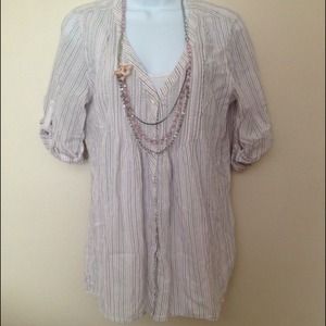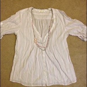 The dressy blouse is white with light pink and gray stripes. In great condition. Also a matching necklace, light pink and silver, a perfect accessory!
