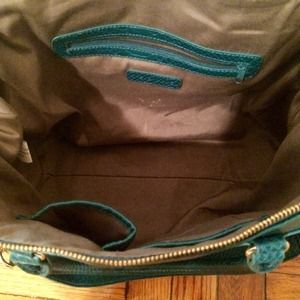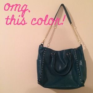 ❌BUNDLED❌This large, textured, teal/turquoise Steve Madden purse is slouchy & spacious with gold hardware. Bag has two clutch straps & a removable shoulder strap with gold chain accents. Top has a zipper closure. Interior has a black & beige herringbone-print lining with two accessory pocket & one zippered pocket, plus one small zip pocket on outside of purse, above gold plate label. Minimal use; one small makeup stain inside, visible in photos. Perfect condition.
