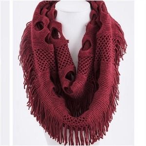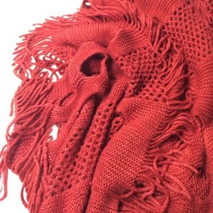 infinity scarf with fringe and circle cutouts. in great condition. more of a rust color than the first picture shows - last three are more accurate. light weight. acrylic knit.